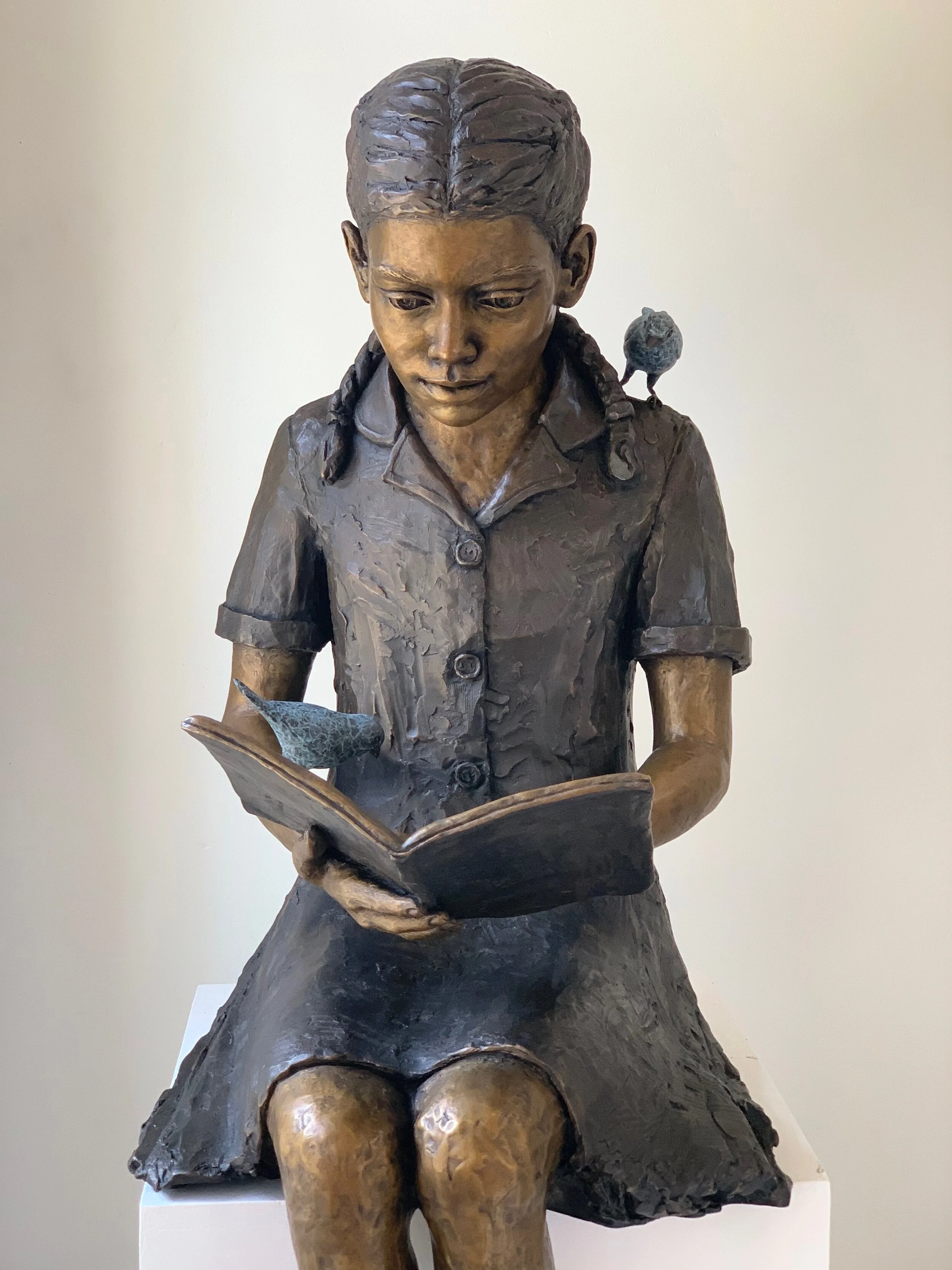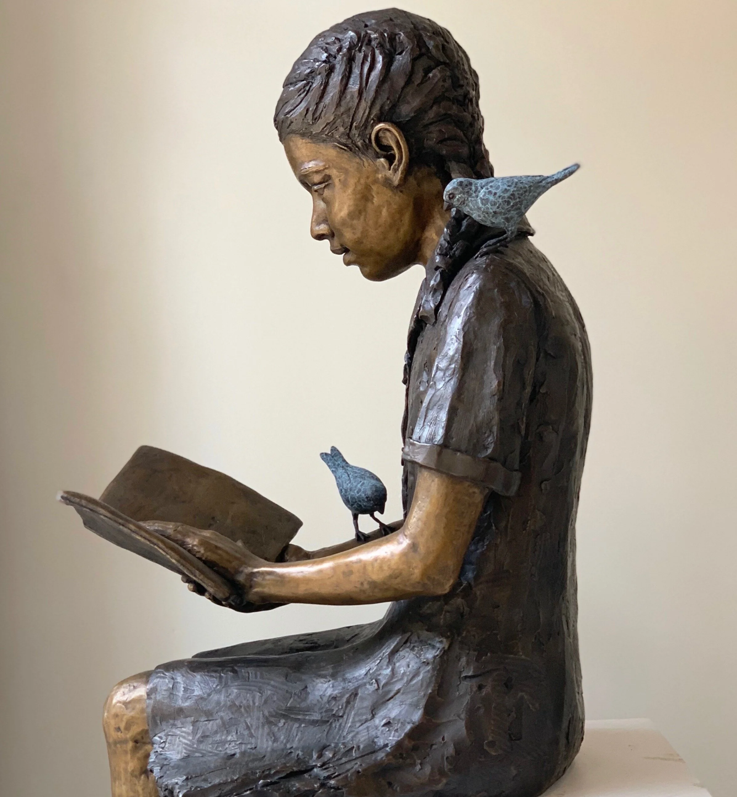 The Reader sits transfixed in the pages of her book. She is so still that little sparrows have come to sit on her to see what she is reading… or perhaps they are part of her story and are coming to life as she reads then? The pages in her book are blank, unscratched by letters.